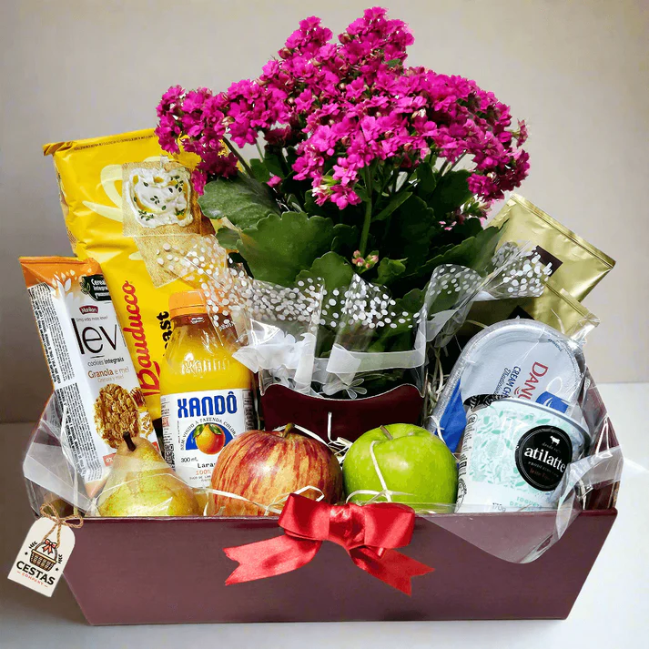 esta decorada para presente, contendo: 2 Drip Cofee (sachê de café com filtro individual, basta acrescentar água quente) 10g, 1 Cream Cheese 150g, 1 Bauducco Toast (alimento integral tipo torrada sabor azeite e ervas) 128g, 3 Frutas selecionadas, 1 Iogurte Natural 170g (Leitissimo ou Atilatte)1 Suco Laranja 100% suco 300ml, 1 pacote de Cookies.