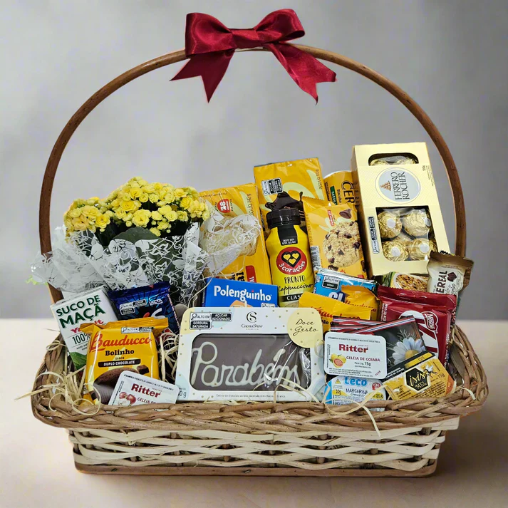 Cesta de Café da Manhã Parabéns com Flores