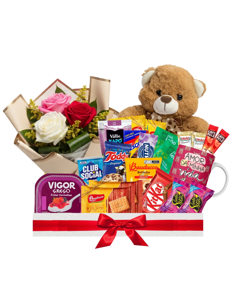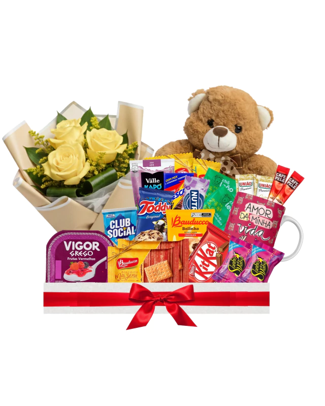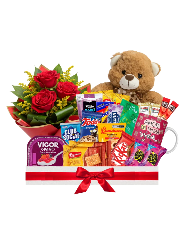 Cesta gesto de carinho com mini arranjo de 3 rosas (Escolha a cor) + ursinho